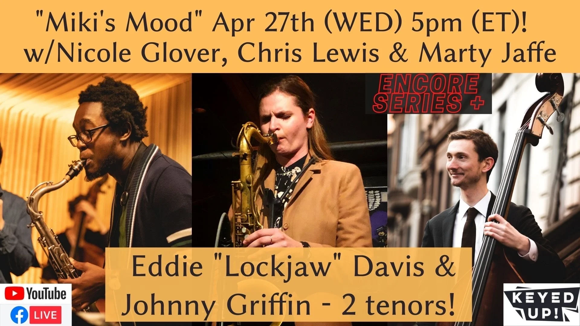Streaming live on Facebook and YouTube! With special guests Nicole Glover, Chris Lewis, and Marty Jaffee. Playing the music of Johnny Griffin & Eddie “Lockjaw” Davis